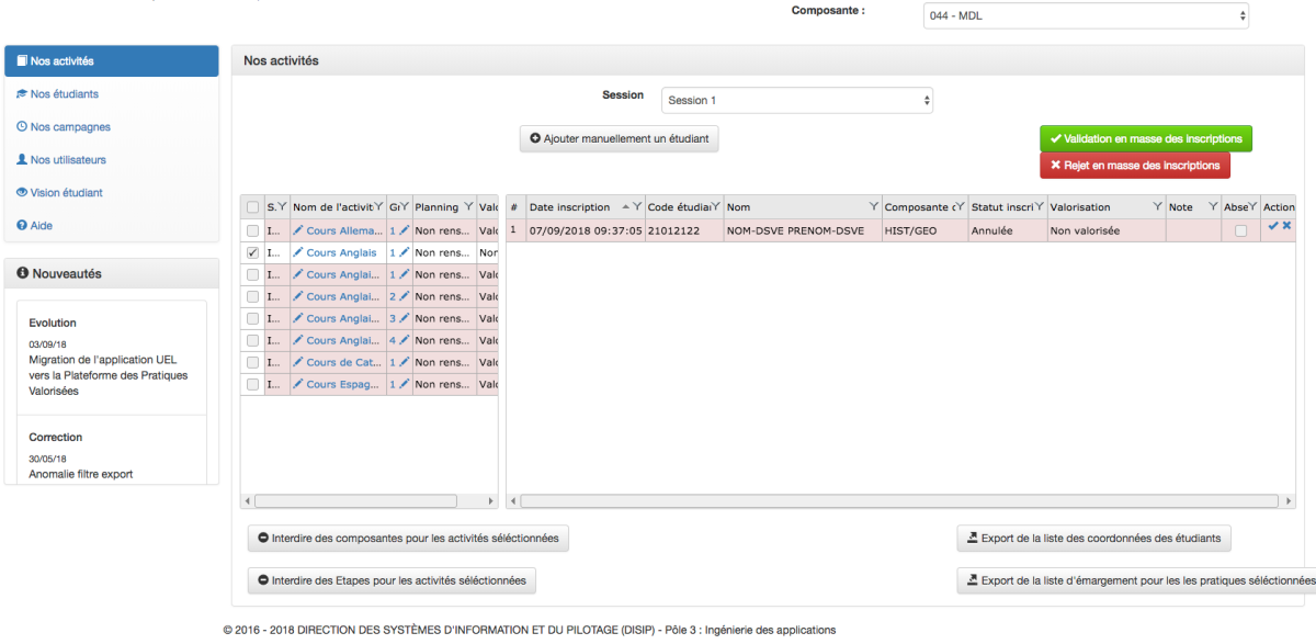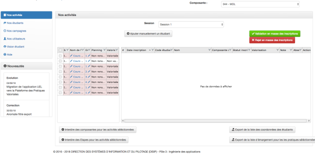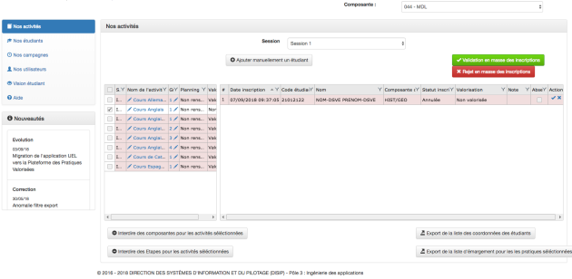 Nos ActivitésSélectionnez une composante pour faire apparaître les activités⚓ Affichage des étudiants⚓Actions : Cochez 1 ou 2 groupe maximum pour la même activité.Conséquences : Affichage des étudiants qui ont effectué un choix dans les groupes d'activités.Sous-sections :Trier et FiltrerAjouter manuellement un étudiantStatut d'inscriptionExport Format ExcelEdition d'une ActivitéEdition GroupeColorisationEvaluation