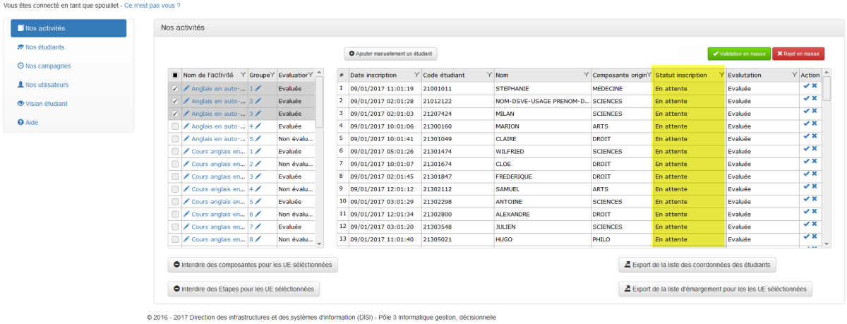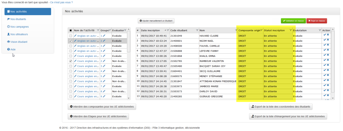 Conséquences : Affichage des étudiants correspondant aux choix du filtre.