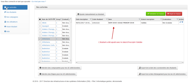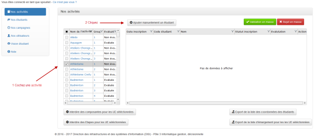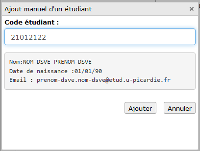 Ajouter manuellement un étudiantSélectionnez un groupe, puis Cliquez sur le bouton Ajouter manuellement un étudiant.⚓Actions : Saisir le numéro de l'étudiant, puis cliquez sur le bouton Ajouter.AttentionCocher un seul groupe pour une Activité.⚓