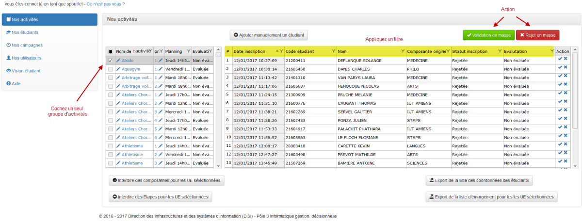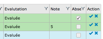 Actions : Si vous souhaitez tout de même rejeter l'inscription il faut soit décocher l'absence soit supprimer la note