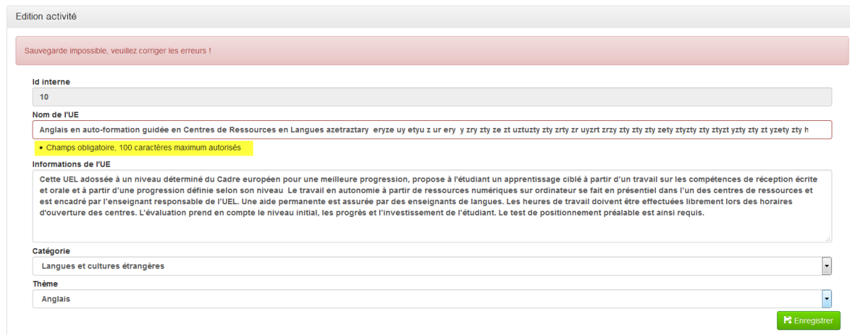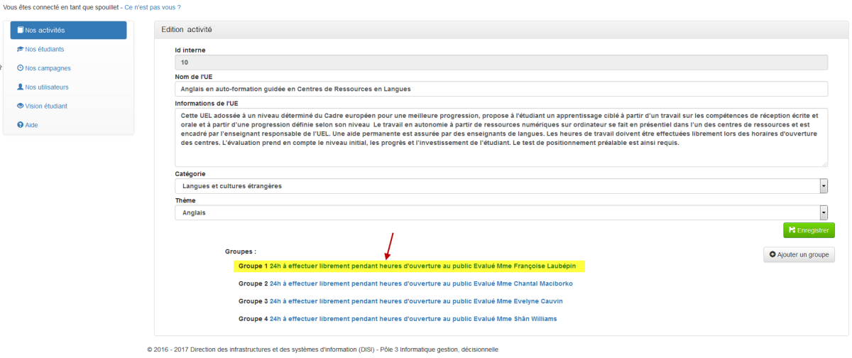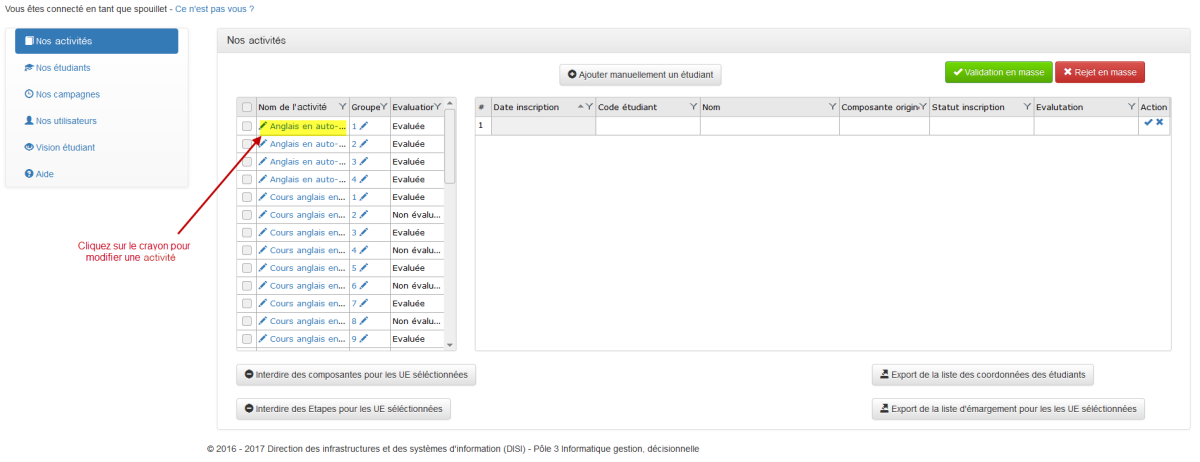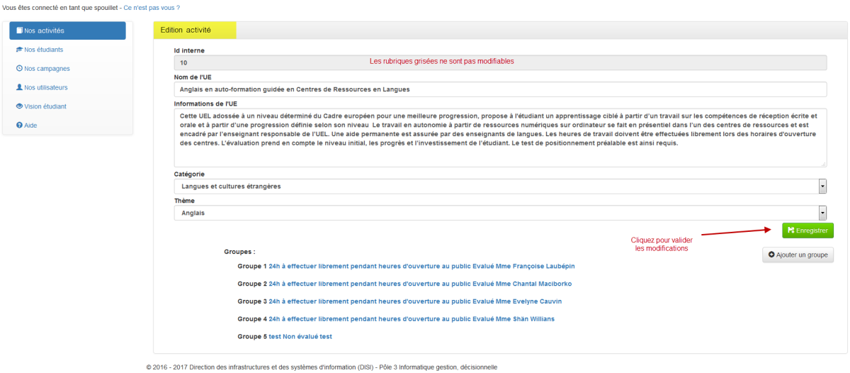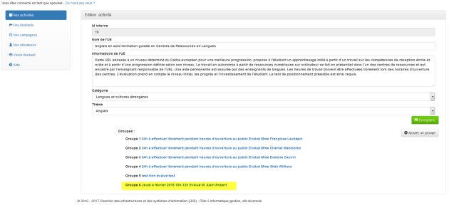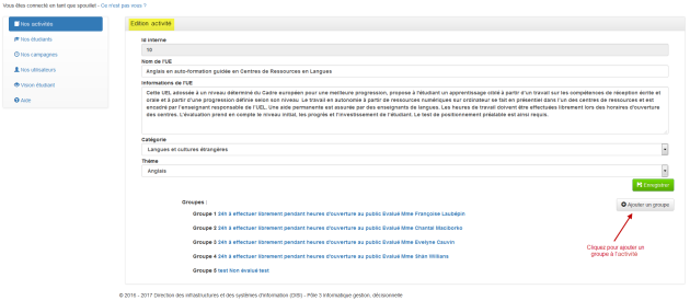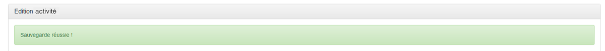 Edition d'une ActivitéCliquez sur le symbole Crayon d'une activité⚓Actions : Procédez aux modifications de la description de l'activité.Actions : Vos modifications ont été prises en compte.Actions : Procédez aux corrections demandées.Pour ajouter un groupe à une activité, cliquez sur le bouton "Ajouter un groupe".⚓Actions : Renseignez les informations concernant le groupe.Actions : Le nouveau a été rajouté avec succès.RemarqueRaccourci "Edition groupe", cliquez sur un groupe.⚓Actions : Edition du groupe.