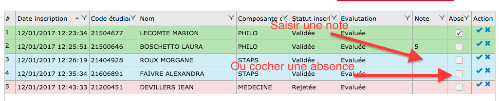 Action : Saisir l'évaluation (Note ou Absence) sur les inscriptions validée (Lignes bleues)