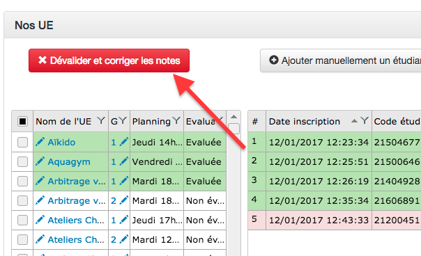 Action : Cliquer sur Dévalider et corriger les notes