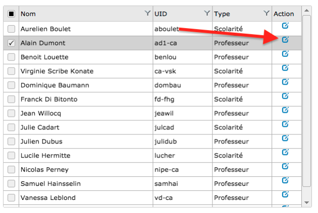 Action : Sélectionnez l'utilisateur de type "Professeur"